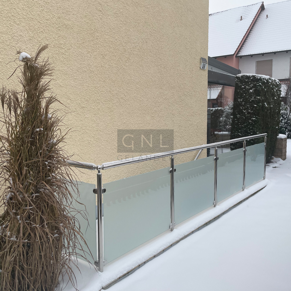 Our railing infill consists of laminated safety glass (VSG) with a thickness of 8.76 mm. There are also different types of glass to choose from: clear, grey-tinted and frosted glass – the latter is recommended if you want privacy protection.